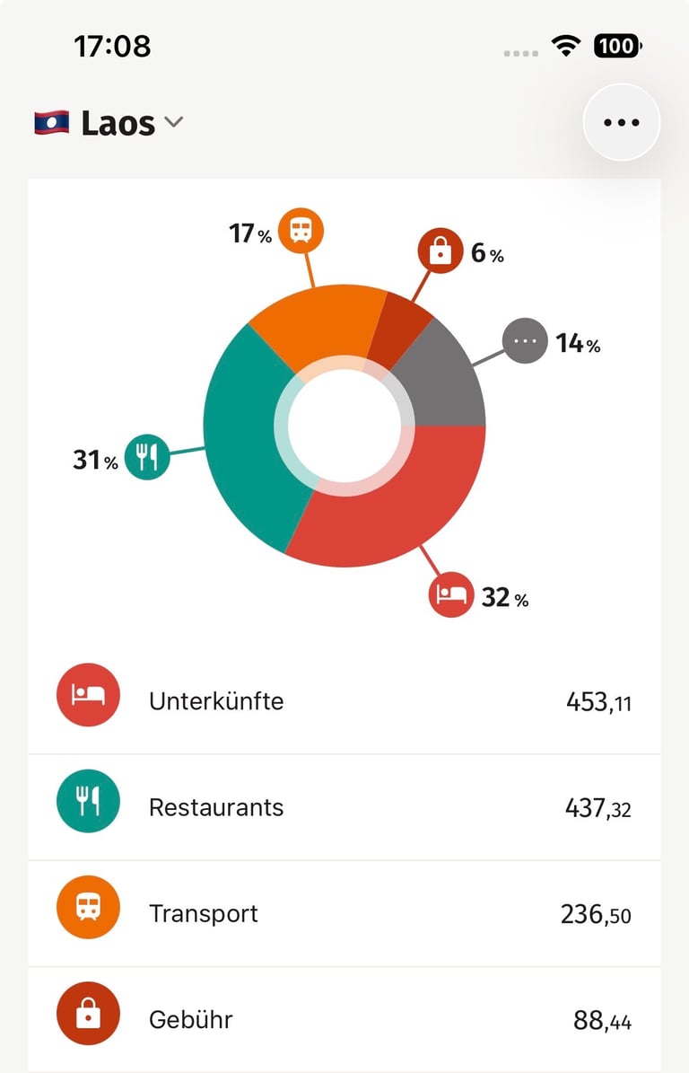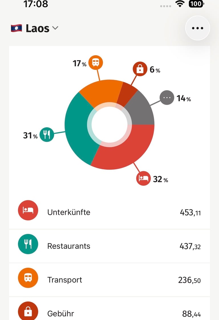 In den Screenshots siehst du unsere Laos-Kosten als Paar (28.12.25–24.01.26) welche im Schnitt bei rund 50 € pro Tag für zwei Personen – also etwa 25 € pro Person lagen.